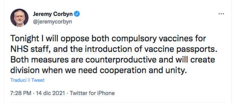 Al di là di qualsiasi altra valutazione, soggettiva e personale, su Jeremy Corbyn, sul GP e sull’obbligo vaccinale, l’ex leader laburista dà prova di un’autonomia di pensiero e di azione che in molte altre sinistre occidentali (compresa quella italiana, che lo ha celebrato come un’icona ) sembra mancare del tutto, ripiegate su un’ortodossia securitaria spesso più vicina alla superstizione (e/o a motivi di interesse) che alla scienza.