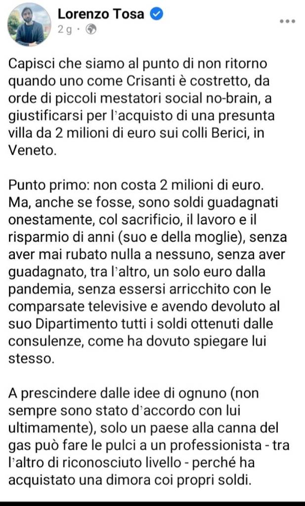 Tosa ed una certa sinistra sembrano scoprire adesso che il guadagno e lo stesso arricchimento non sono un male a prescindere, quando onesti e legittimi (e ad oggi non abbiamo motivo di dubitare dell’integrità di Crisanti). Ce ne rallegriamo e ci permettiamo di ricordare che i liberali lo sostengono da sempre, come da sempre sostengono la necessità di aiutare, e non di vessare con tasse ideologicamente punitive, l’iniziativa privata ad ogni livello, perché è l’inizitaiva privata a creare lavoro e ricchezza per tutti, a sostenere anche il SSN e l’università.