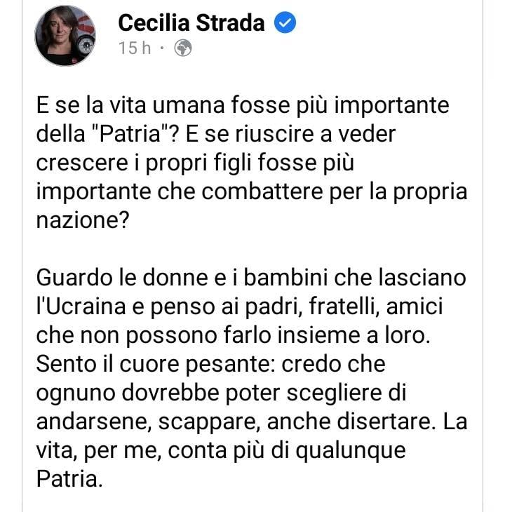 Mettendo da parte la semplificazione (intenzionale) del concetto di “patria”, questa riflessione di Cecilia Strada è emblematica della politica e dell’identità ideologica stessa di una certa sinistra, forse non solo italiana.