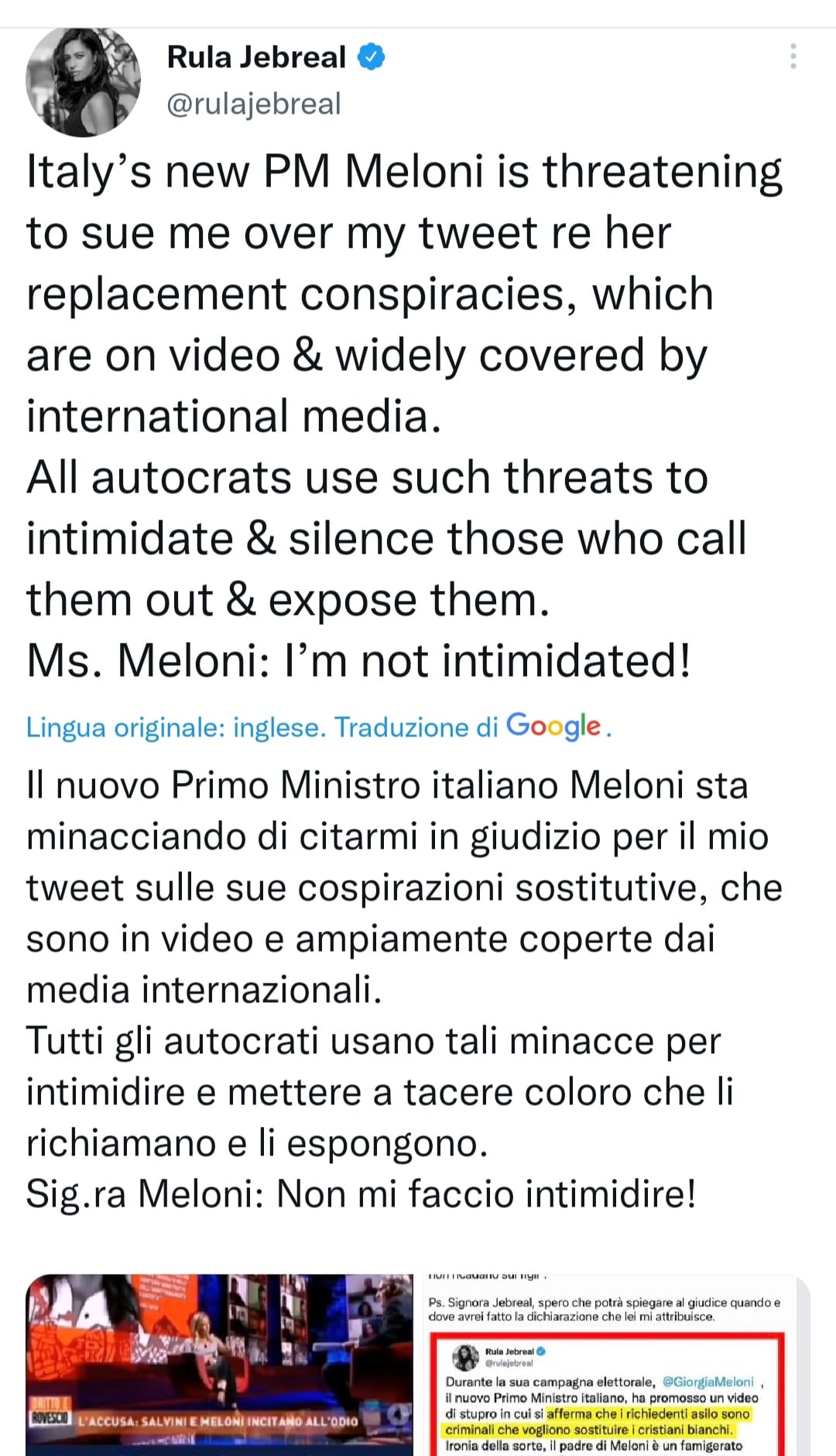 Mostrandosi refrattaria a qualsiasi autocritica, Rula Jebreal indossa i panni della resistente e della martire minacciata e intimidita (la legge, ricordiamolo, dà a Giorgia Meloni tutto il diritto di querelarla). Il bisogno del nemico, di nuovo (la leader di FdI sarebbe addirittura una autocrate), come feticcio narcisistico e come (debole) sostitutivo di un argomentare concreto e proficuo. Una certa sinistra è già partita malissimo.
