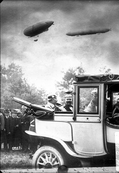 L’imperatore di Germania Guglielmo II e l’erede al trono dell’Impero austro-ungarico Francesco Ferdinando, all’interno di una macchina durante una dimostrazione dell’esercito tedesco (1912). Sullo sfondo, il dirigibile Zeppelin e velivolo Papillon.