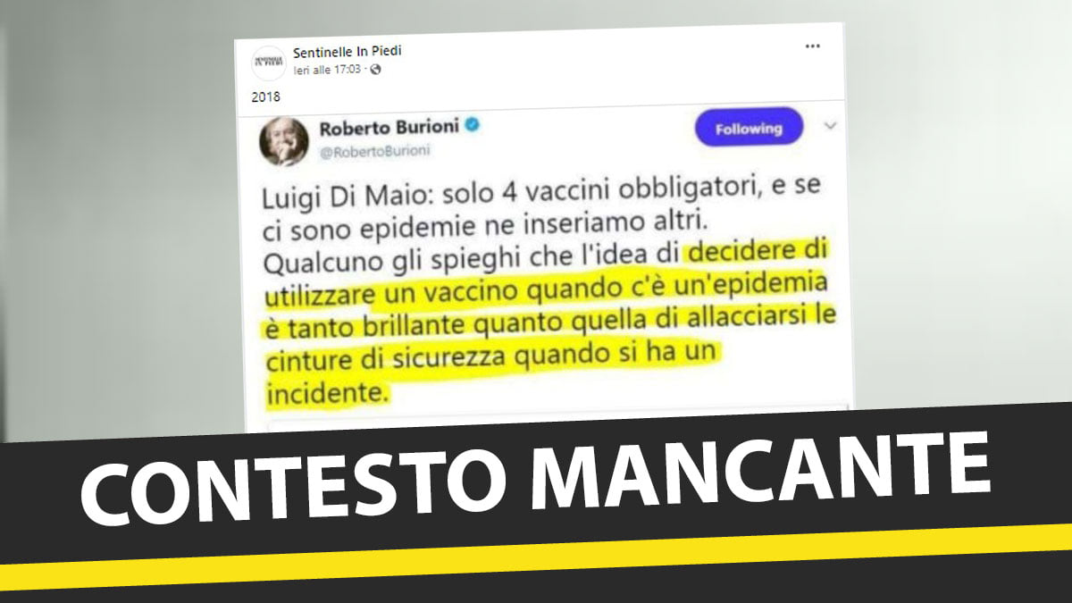Facebook ha deciso di intervenire nella questione del tweet di Roberto Burioni (risalente al 2018 e tornato virale negli ultimi giorni ) sulle vaccinazioni durante una fase epidemica, avvisando che le dichiarazioni del medico marchigiano sarebbero state riprese senza tener conto del contesto dell’epoca e dunque in un modo che potrebbe “fuorviare le persone”. Sempre Facebook fa sapere che la valutazione è stata compiuta da “fact-checker indipendenti di Open” , pertanto il social ha deciso di inserire un banner che metta in guardia gli utenti (“contesto mancante”).